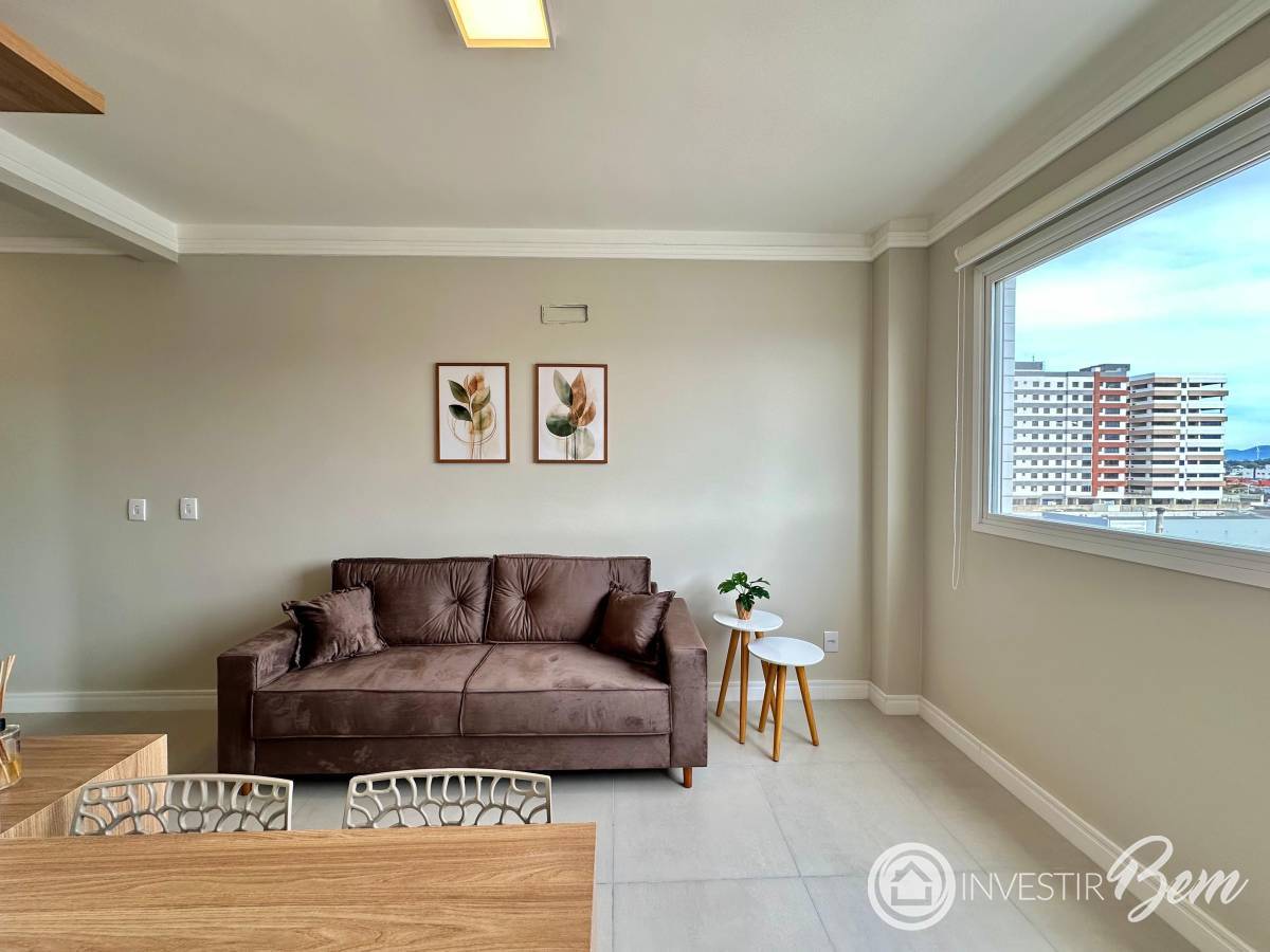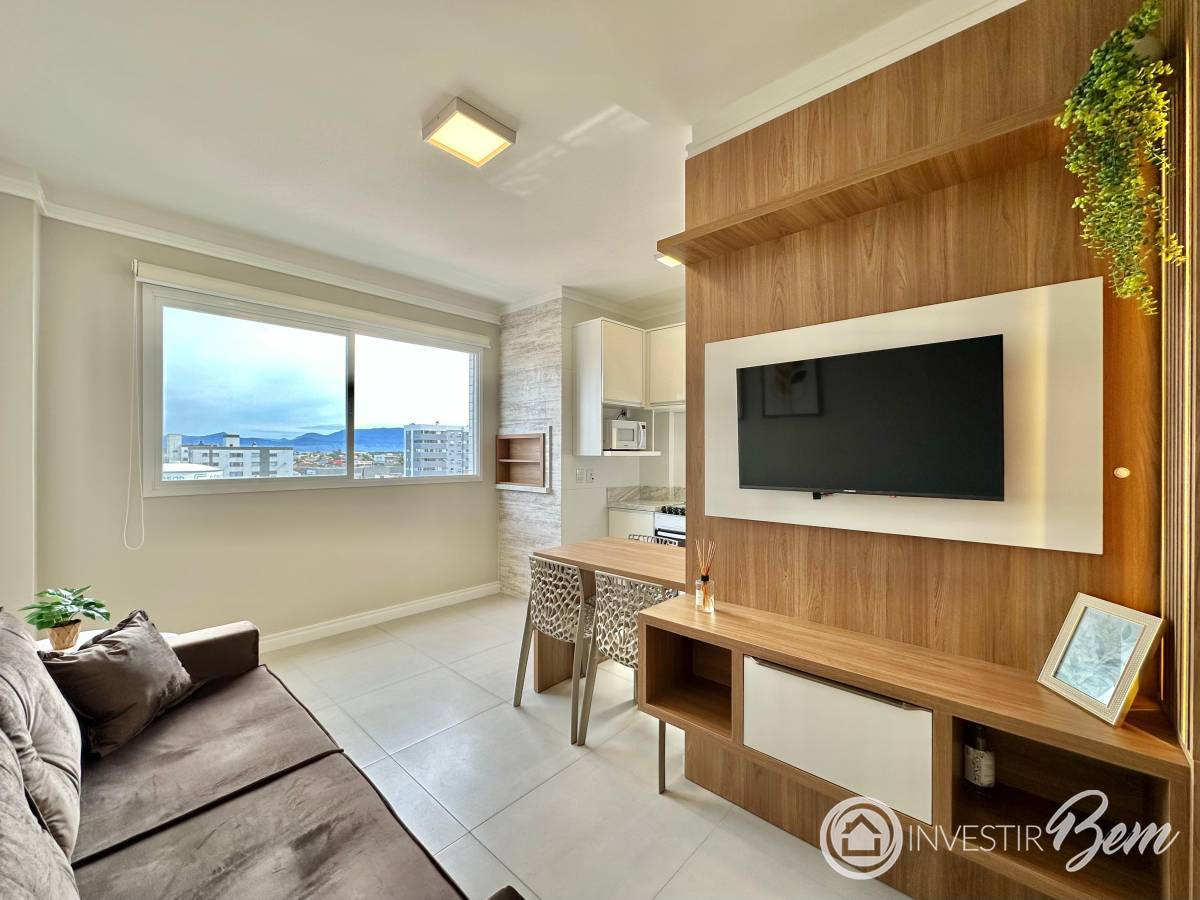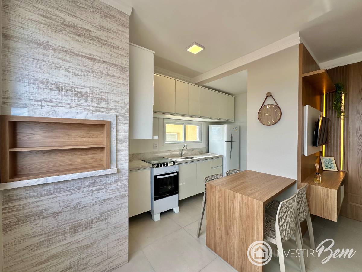 Composto por 1 dormitório, banho social, living 2 ambientes COM AMPLO TERRAÇO, cozinha americana, churrasqueira, área de serviços e 1 vaga de garagem. Imóvel novo, totalmente mobiliado e decorado - pronto para usar! Padrão de acabamentos A: piso porcelanato, esperas para splits e para água quente, gás central, hidrômetro individual. Ótima localização, próximo de supermercados, restaurantes e comércio.
