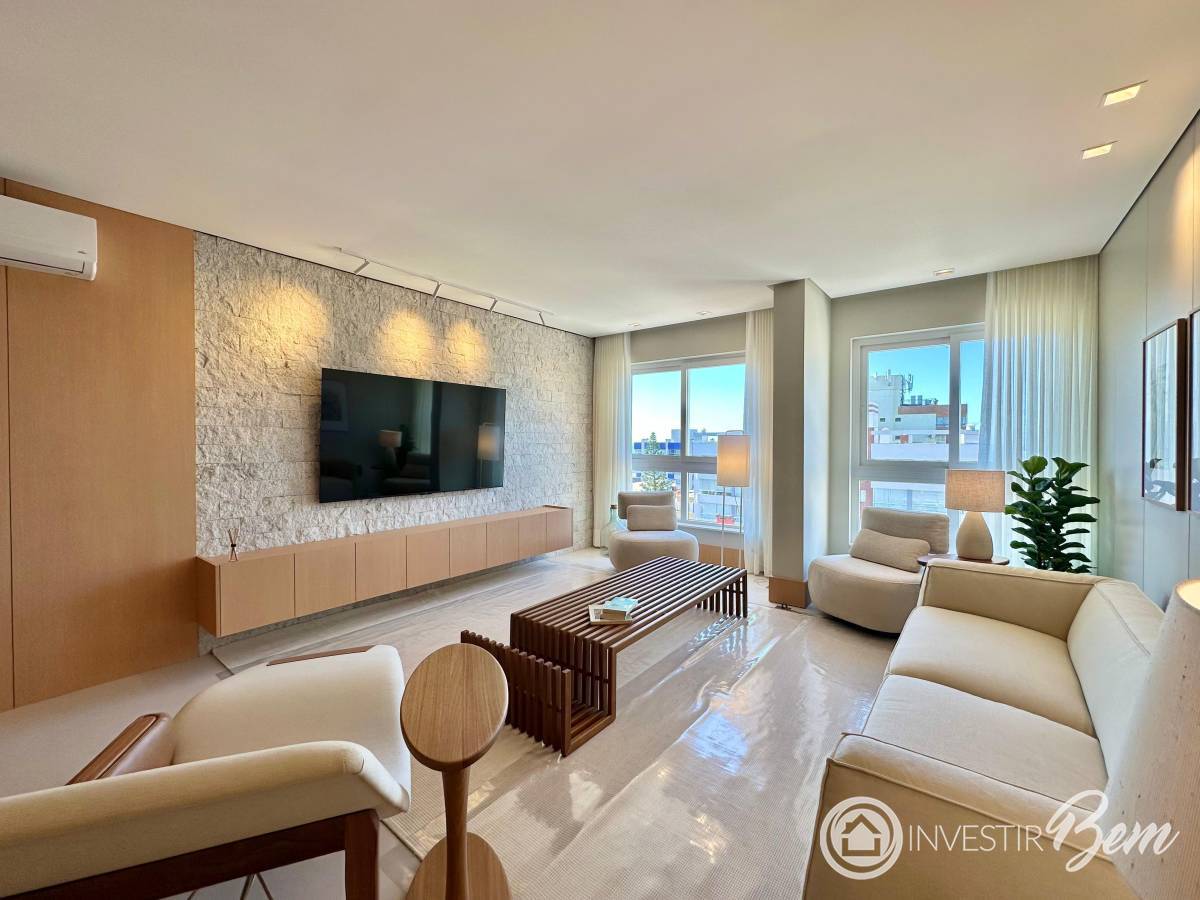 Apartamento de alto padrão com 125m², localizado no 9º andar e com posição solar leste/norte, garantindo excelente iluminação natural e vista parcial para o mar. O imóvel conta com 3 suítes amplas, lavabo, área de serviço e um living espaçoso com 51m², ideal para receber amigos e familiares. Totalmente mobiliado e decorado com móveis planejados de alto padrão, armários sob medida e peças soltas assinadas por Salva, Tissot, Feeling e Contemporânea. O apartamento possui acabamentos de extremo bom gosto, com piso laminado amadeirado na área íntima, porcelanato Porto Belo 1, 60x1, 60 no living e lastras Porto Belo 1, 22x2, 44 nos banheiros, que são revestidos até o teto. Conta ainda com persianas motorizadas com controle remoto, refrigeração completa com splits inverter em todos os ambientes, TVs em todos os quartos e uma de 82" no living. A cozinha está equipada com eletrodomésticos Brastemp e Samsung, além de cervejeira e adega Venax. São duas garagens individuais no térreo. Um imóvel completo, pensado para quem busca conforto, sofisticação e praticidade para morar tanto no verão quanto no inverno.