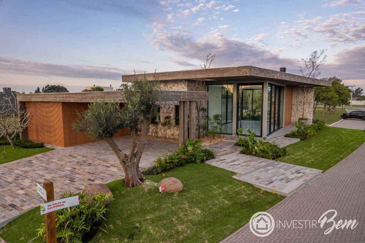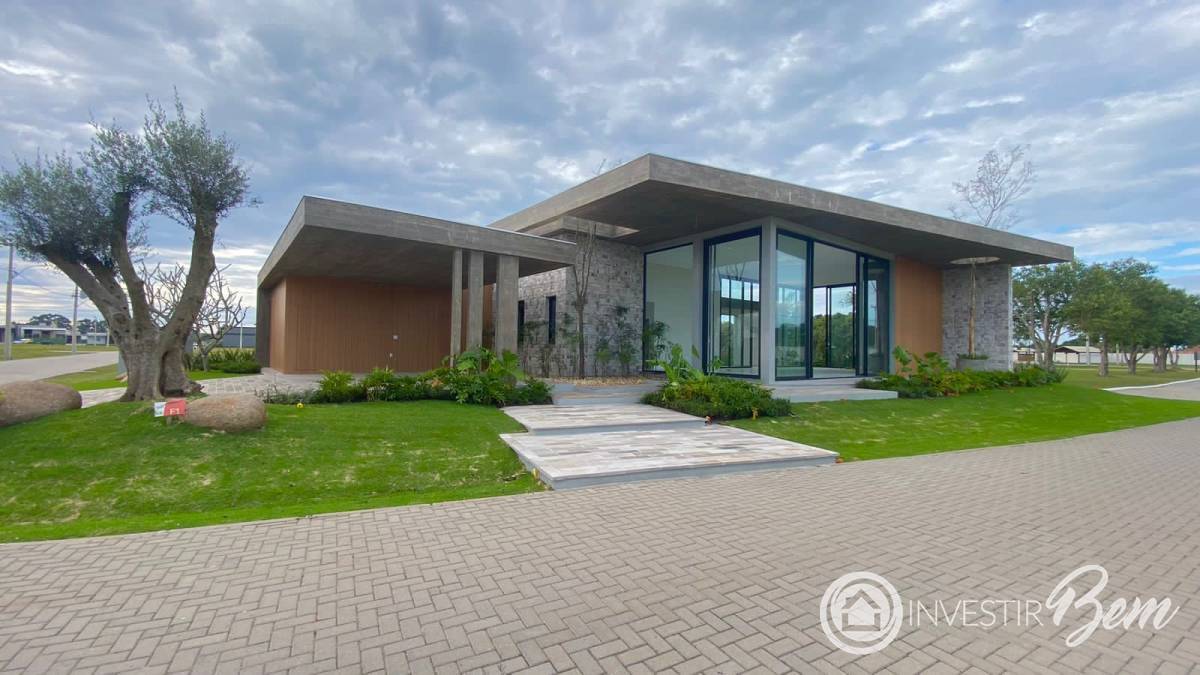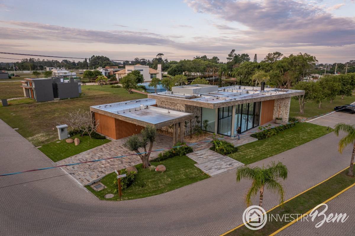 Casa térrea Á VENDA em Condomínio Fechado no Litoral Gaúcho. 4 suítes, sendo 1 máster com banheira; Sala de estar e jantar integradas ao espaço gourmet; Pé-direito duplo de 4, 50m; Lavabo interno e externo; Depósito interno e externo; Lajes em balanço com concreto aparente; com 324m² de área total; Esquadrias em PVC preto - Rost; Irrigação automatizada; Abrigo para 3 carros (cobertos); Amplo terreno de esquina na Av. e de frente para o Lago: Casa exclusiva com 3 posições solares. Entre em contato para mais informações.