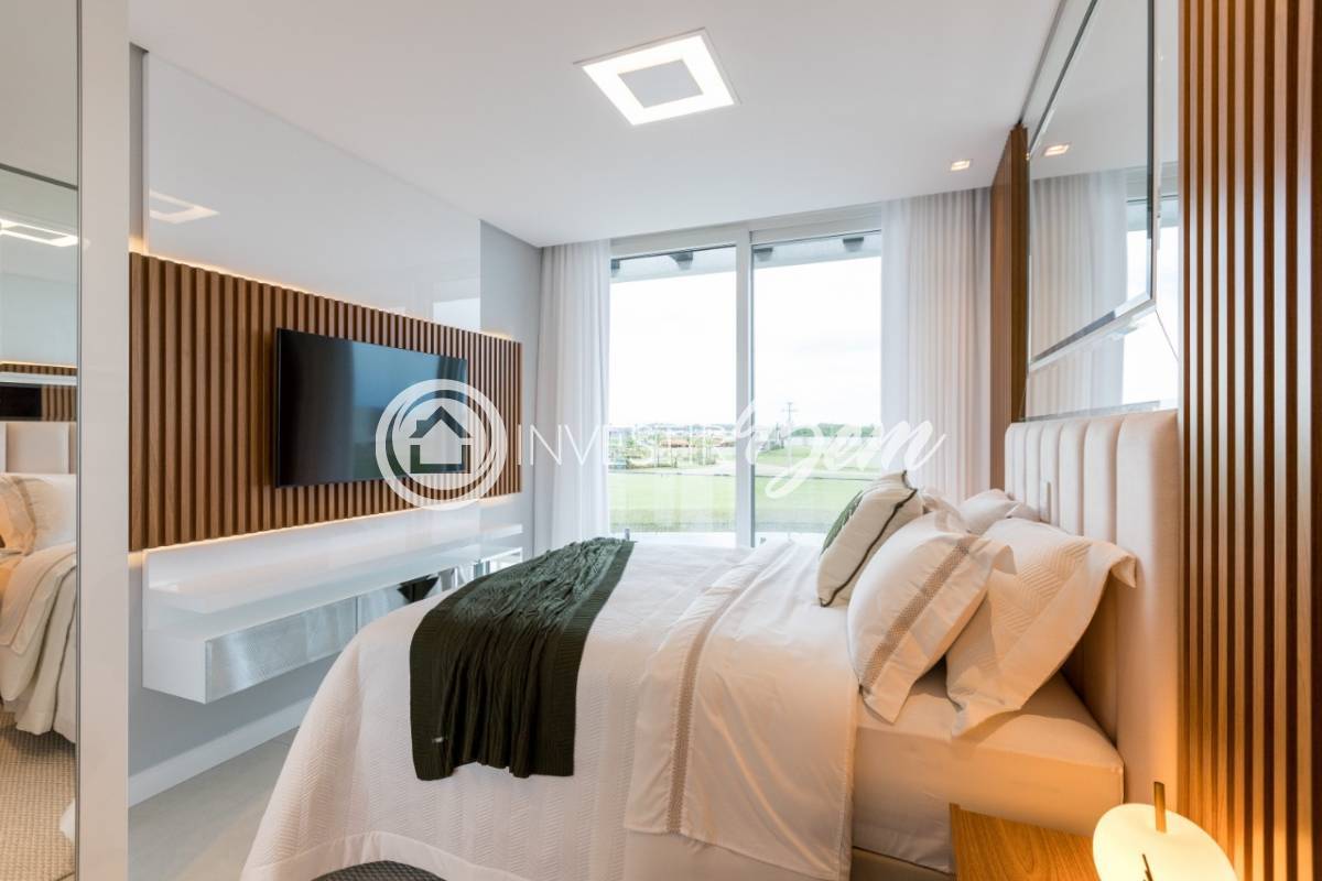 Alto padrão e requinte, este amplo sobrado de 5 suítes, sendo 3 suítes com sacada e vista para o lago, a suíte master com banheira e closet tem 469, 21m2 de área privativa, amplo living integrado com 135m2, lareira, lavabo, elevador, churrasqueira gourmet, cozinha tipo americana com bancadas esculpidas em porcelanato, moveis e decoração em alto padrão de acabamento, produzidos exclusivamente para a casa, pé direito duplo, escada revestida em porcelanato, sala de cinema com sistema de som independente, automação de toda a iluminação, cortinas, persianas e climatização da casa, melhor posição solar do condomínio, pátio com piscina com spa de hidromassagem, condomínio com infraestrutura completa de lazer e segurança, tudo que você precisa para ter momentos incríveis. Venha conferir com nossa equipe especializada. Agende sua visita (51)3416.4445